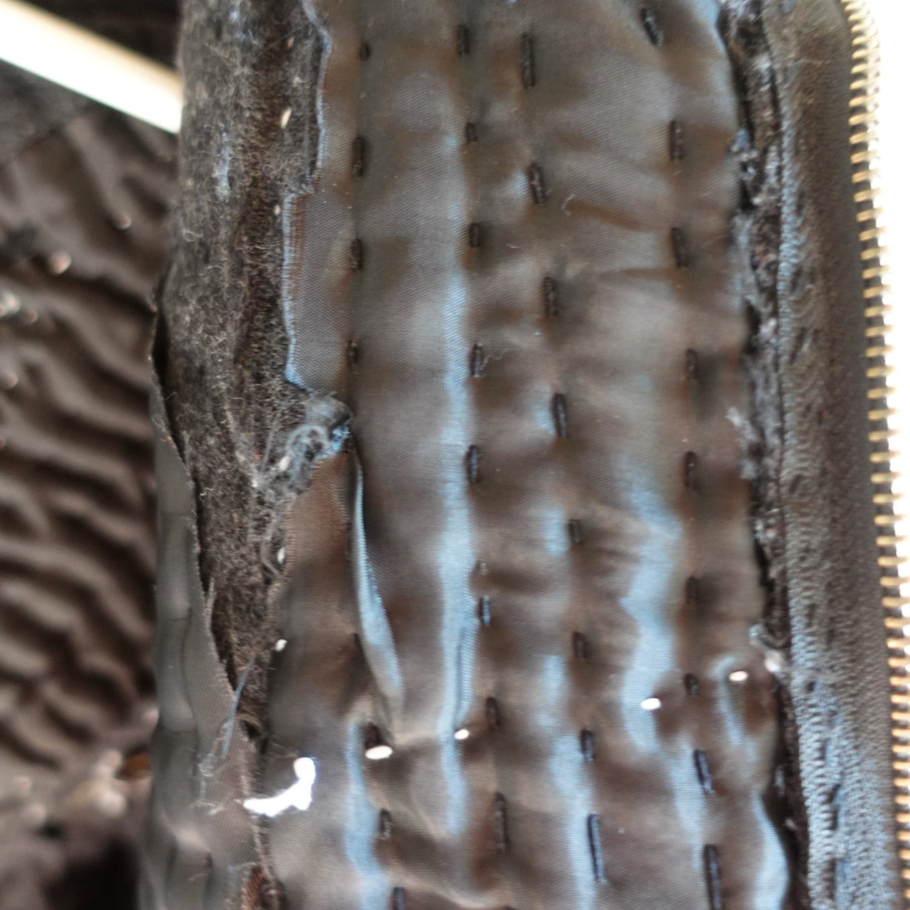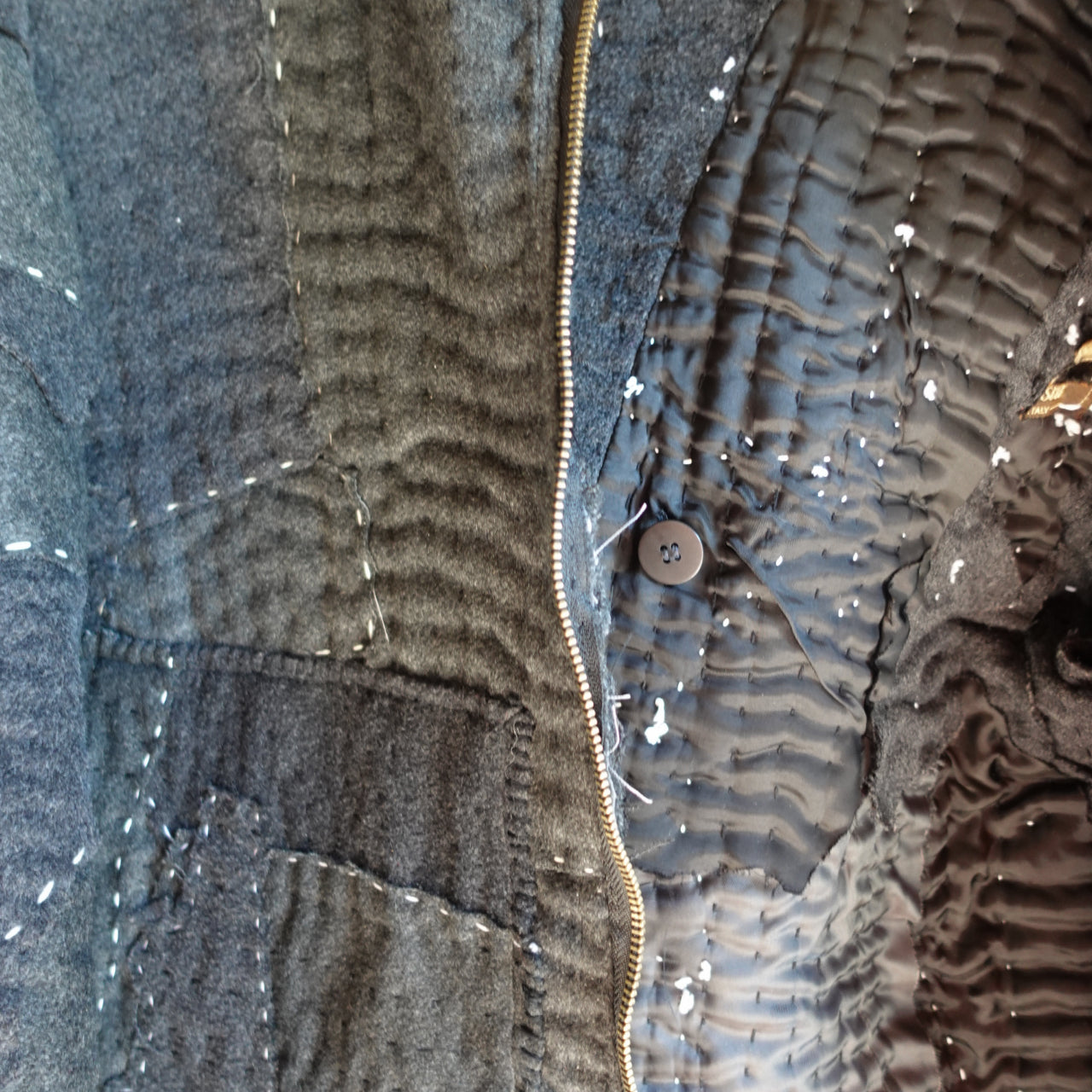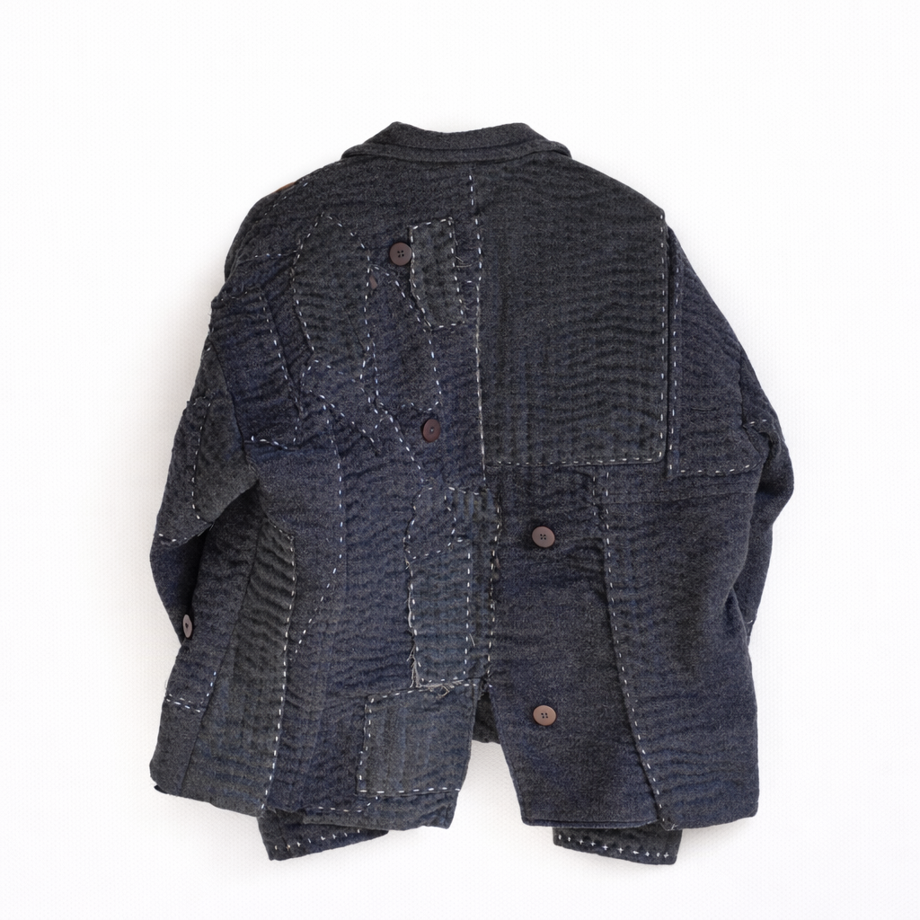 ヴィンテージのウールコート(100% Cashmere)2着を一度解体し、細かいパーツに分解。その後、細かい各ピースを刺し子により一枚の布につなげ合わせ、ジャケットへ再構築した一点物。